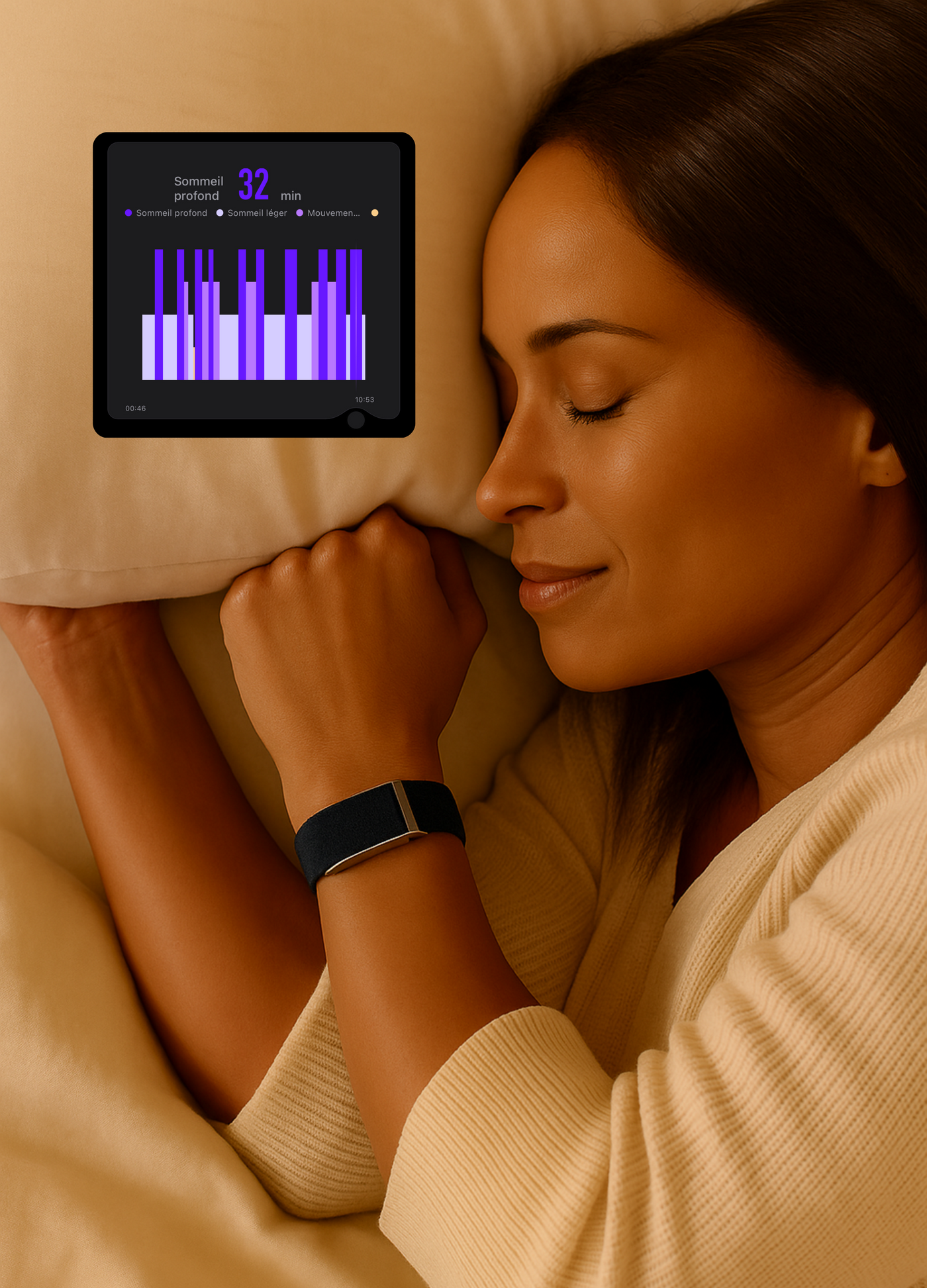 BIONNY precisely measures the four phases of your sleep: light, deep, REM and awake, allowing you to truly understand the quality of your nights. With this data, you identify what's disrupting your recovery and make the right decisions to improve your energy, mood and performance every day.